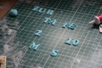 Auf jeden Fall sollte auf der Tauftorte der Anlass, der Name des Kindes und das Taufdatum stehen. Dazu habe ich mit Zahlen- und Buchstabenausstechern die notwendigen Zahlen und Buchstaben ausgestochen (siehe Foto). Diese habe ich ein paar Minuten in der Form antrocknen lassen und dann mit einem Pinsel leicht herausgedrückt. Bevor die Zahlen und Buchstaben auf die Torte geklebt werden, empfehle ich sie zuerst auf die Torte zu legen, damit man sie noch verrücken kann. Erst wenn ihr der Meinung seid, dass alles passt und gut aussieht, können die Dekoelemente mit Zuckerkleber befestigt werden.
