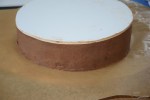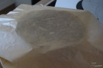 Bei dieser Torte habe ich diesmal ein Cakeboard verwendet, welches ich ca. 2 mm größer als den Durchmesser der Torte ausgeschnitten habe (Schritt 1). Dann habe ich nach der zweiten Schicht Ganache ein Stück Backpapier oben auf die Torte aufgelegt und mit den Händen glatt gestrichen (Schritt 2). Anschließend habe ich die Torte gestürzt (Schritt 3), die Lücken mit Ganache gefüllt und die Ganache mit einer Teigkarte rund herum glatt gestrichen. Diese Methode hat den Vorteil, dass man eine tolle, rechteckige Kante hinbekommt. So wird die Torte dann nochmal für ein paar Minuten gekühlt, bevor die Torte wieder gestürzt und das Backpapier abgezogen wird (Schritt 4).
