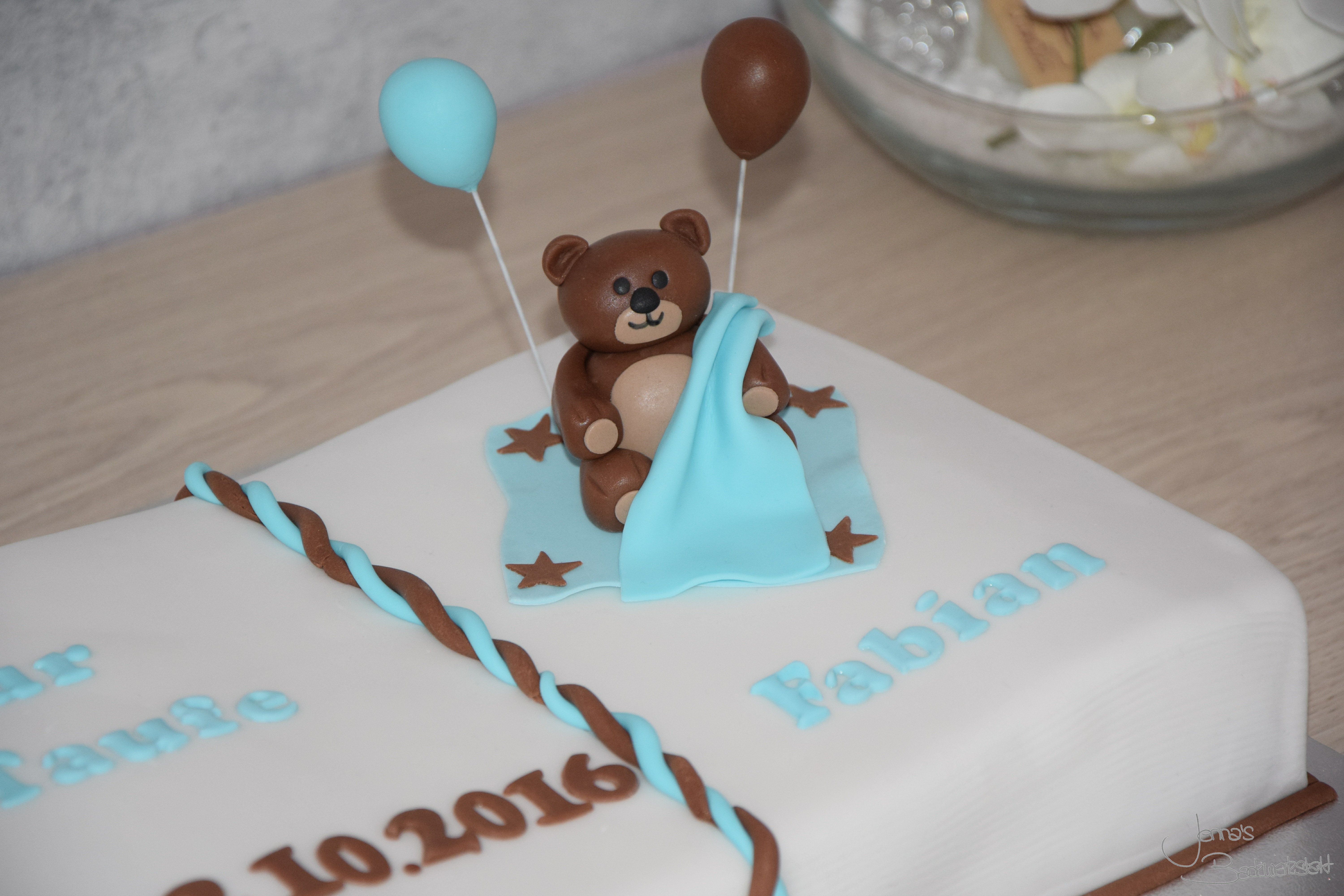 Tauftorte in Buchform mit Teddy