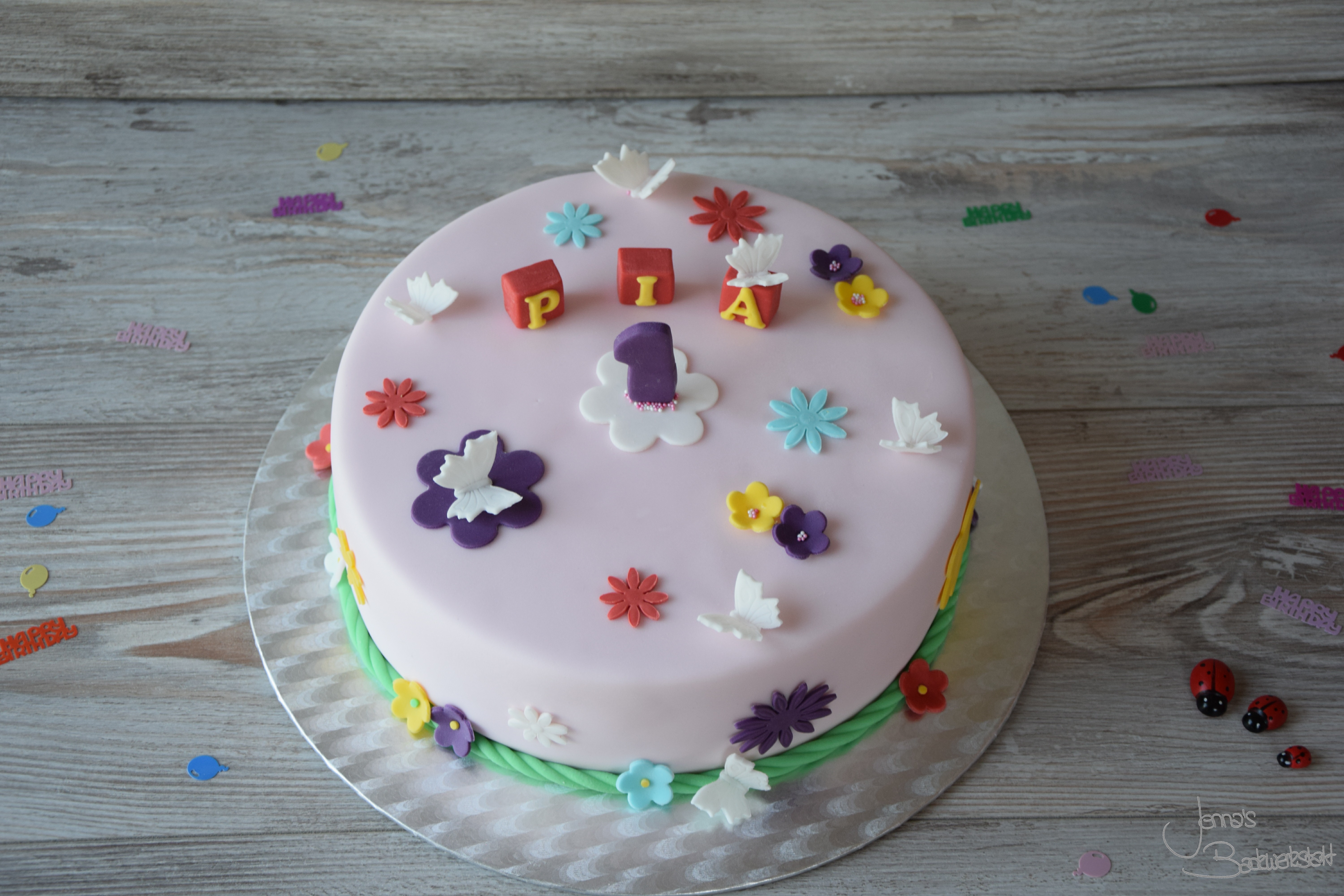 Motivtorte zum 1. Geburtstag mit Blumen und Schmetterlingen